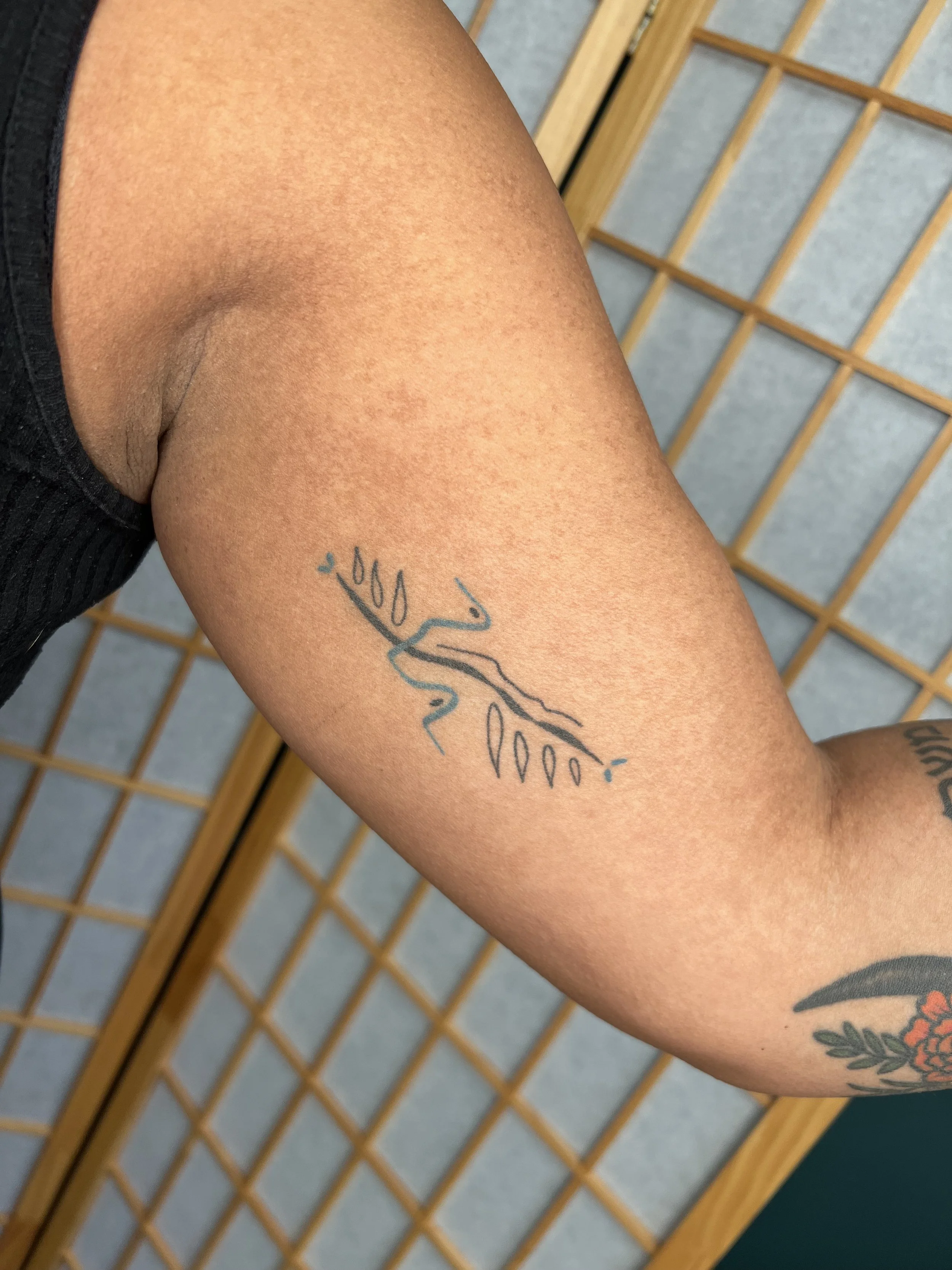 Laura has been illustrating and practicing hand poked tattooing since 2020. Drawing inspiration primarily from both ancient and modern folk art, their art aims to fuse a whimsical, “outsider” graphic composition with more contemporary color blocking.